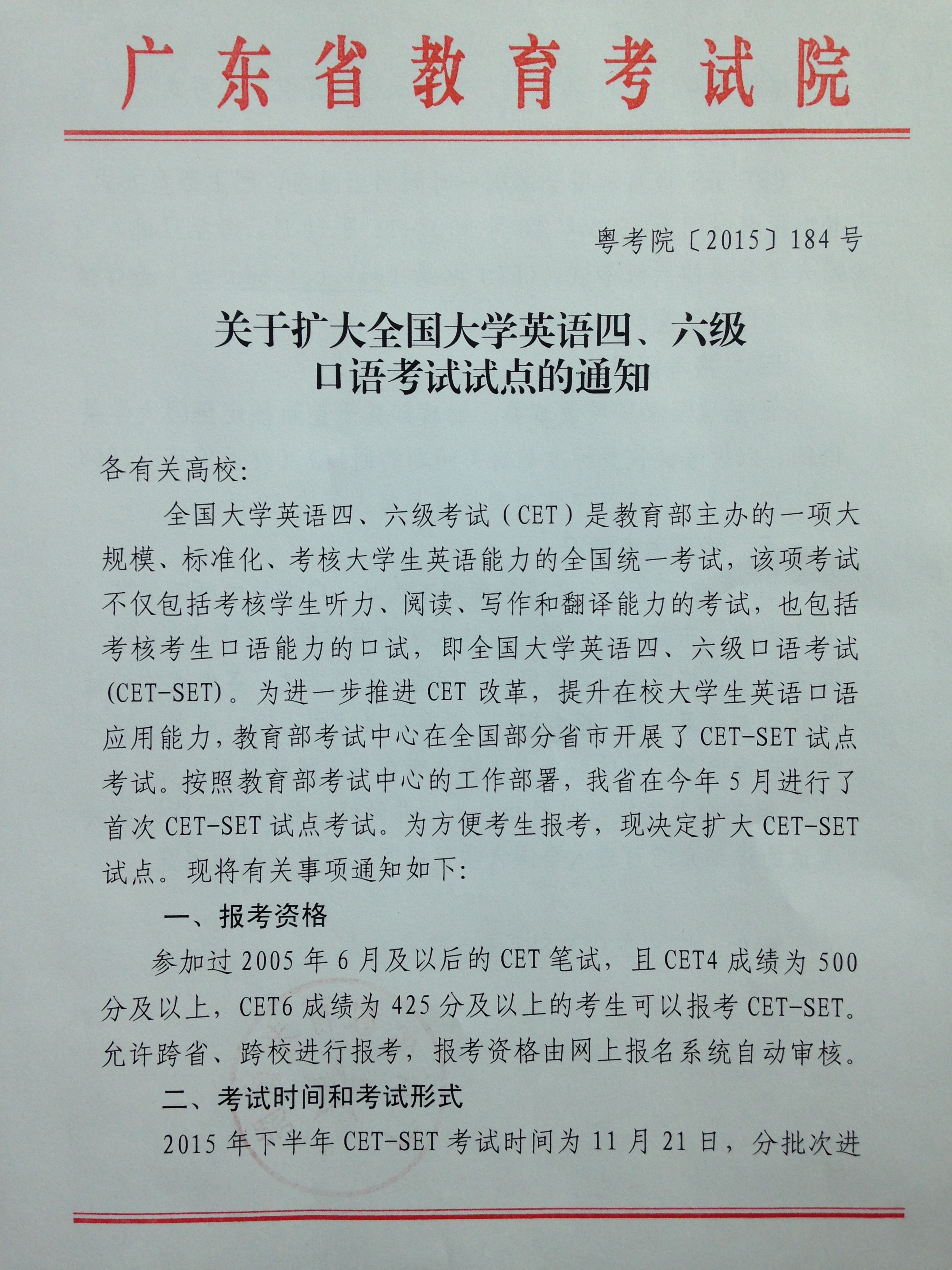 关于扩大全国大学英语四、六级口语考试试点的通知