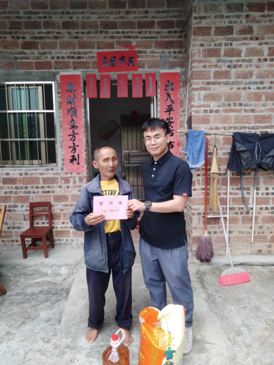 然后,到广宁县横山镇罗帷村的贫困户1户(黄秀枝家庭人口3人),无劳动力低保户1户(邓文洪家庭人口5人),五保户4户(李木先家庭人口1人;陈志光家庭人口1人;陈维贤家庭人口1人;黄瑞光家庭人口1人)进行生活慰问,为每户送上500元资金和200元物资,以改善他们日常生活。慰问期间,党员们与贫困户亲切交谈、唠起家常,并送上美好祝愿。