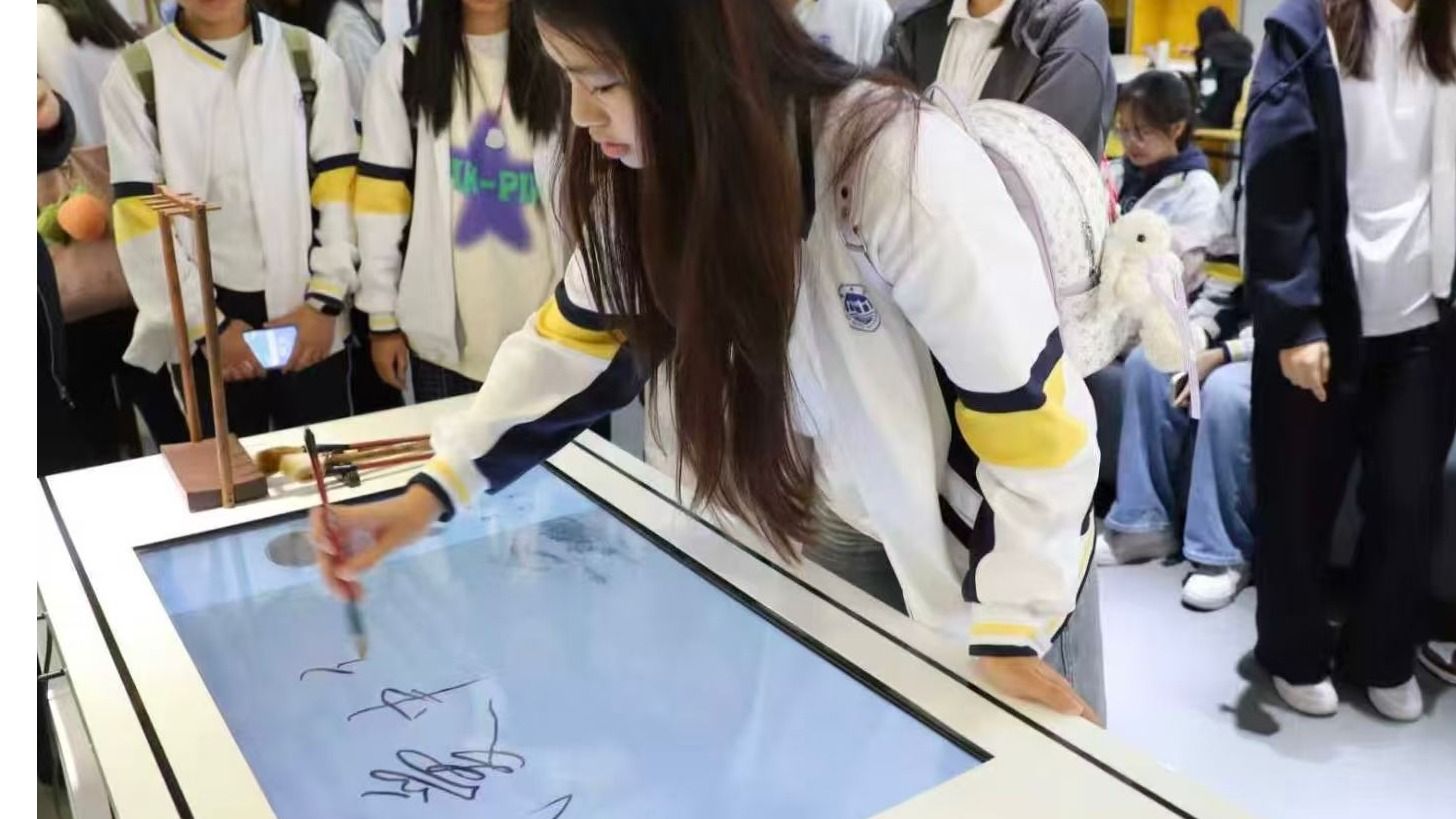 师生一行人前往广东工业大学参观了图书馆的学习环境、视听空间和信息共享空间,体验了无墨毛笔书写、无声弹奏钢琴和封闭亭朗读,感受了浓厚的数字化图书馆氛围。在我校智慧教育产业学院的合作企业广州视睿电子科技有限公司(希沃品牌),参观了公司智慧教育品牌希沃展厅、未来教室、虚拟演播室和微格教室等地方,体验了虚拟抠像、无尘书写、AI课堂教学等先进教学技术,感受AI赋能教育的创新应用。