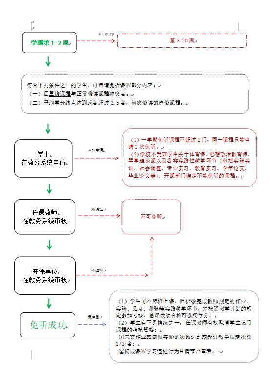 第二十条 符合条件的学生可在每学期开学后两周内由本人申请,经任课教师审核同意、教务处复核批准后准予免听。