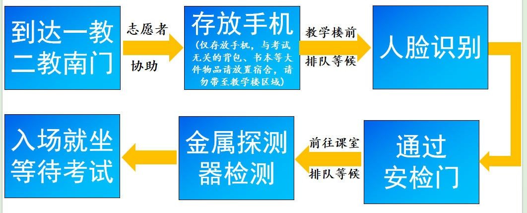 9月13日上午8:00便可到达第一、二教学楼前存放手机(仅存放手机,建议校内考生将与考试无关的背包、书本等大件物品请放置宿舍,请勿带至教学楼区域),随后在教学楼前排队等候进行人脸识别,听到现场指令后,有序通过安检门进行安检,安检通过后径直到达考场,根据监考员要求进行金属探测器检测和查验双证,无误后在考生签到表上签字并落座,等待考试。
